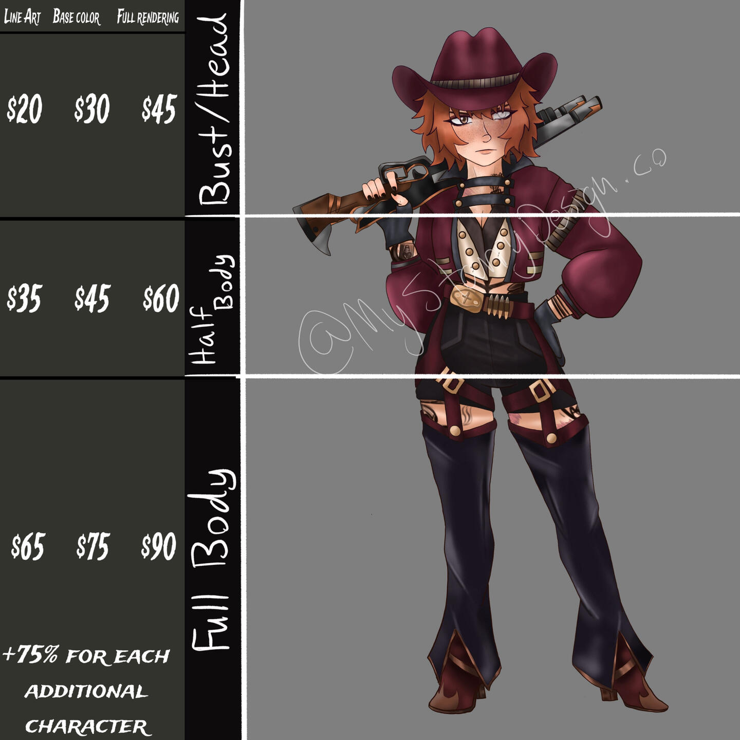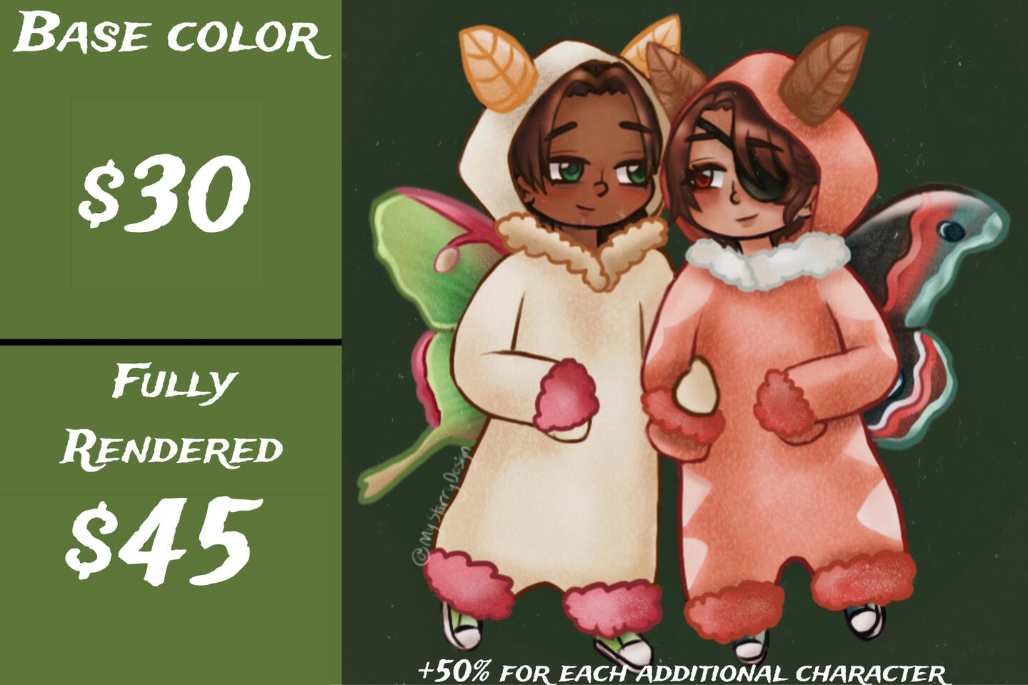 -Any additional character in regular art will be +75%-Any additional character on goobers will be + 50%-Basic color and gradient backgrounds are included but any other background will be additional cost depending on the detailing wanted.-If poses are super complicated or too many detailed elements are added cost may go up some.-I ask that some references be provided for any ocs even if it is a picrew.-I will send rough sketches and updates along the way and will be open to making changes in moderation without additional cost, but large and very detailed changes may be an additional cost.-I am a college student who is also working part time, and I have carpal tunnel so commissions may be a bit of a wait for the final product, but I will do my best to keep that within a reasonable timespan.